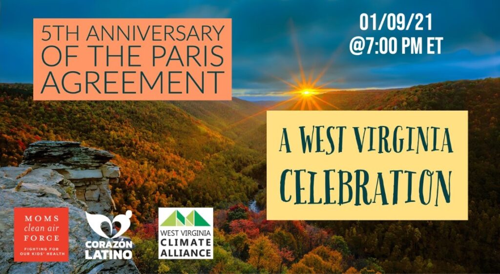 On Saturday, January 9, at 7 p.m. EST, Corazón Latino, Moms Clean Air Force, Ohio Valley Environmental Coalition, WV Rivers Coalition, Redescubre El Yunque, and the WV Climate Alliance will host a Facebook live event to celebrate the 5th Anniversary of the Paris Climate Agreement. The event will include a panel discussion and a special performance from WV musicians Julie Adams, Josh Barrett, and Ron Sowell.