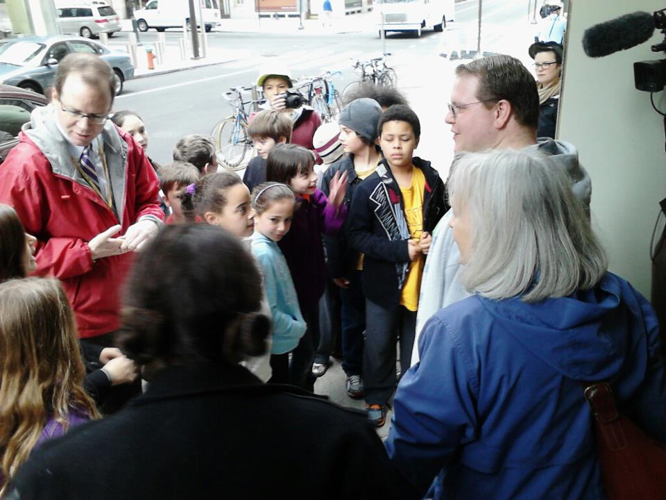 Dustin White and Jane Branham explaining mountaintop removal to a group of 4th graders outside the EPA Dist 3 office in Philadelphia.