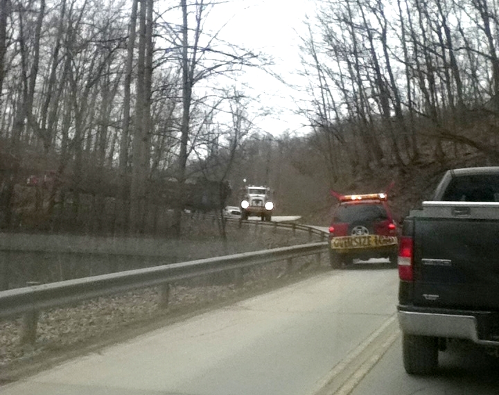 Due to the Marcellus Shale gas “boom” here, in north-central West Virginia, it is not uncommon to find escort vehicles (accompanying oversize equipment heading for or leaving well pads) driving left-of-center, as you can see in the photos below. It goes without saying that this is dangerous for anyone out of the roads. This is just one of a host of problems associated with Marcellus Shale activity here.