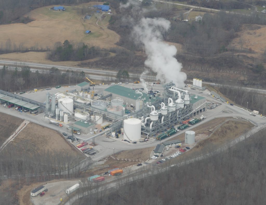 I helped build that facility and occasionally I have helped with some maintenance off and on. The plant treats frack water and they re-use the clean water and the salt that is extracted is being stored in that big excavation that you’re seeing. The boilers there run off of natural gas and the plume is the steam from the water cooling towers. I’m sure some of the neighbors dont like having an industrial site that close but it seems pretty clean-running to me. The fact that they are treating and recycling frack water seemed pretty exciting to me. I’m not sure what they’re going to do with the salt but it was possibly going to be used on the roads.