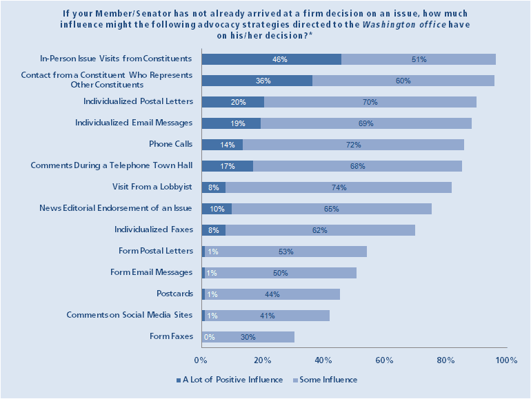 While the above chart is about Congress, the same applies for our state lawmakers. 97 percent of Congressional staff say that in-person issues visits from Constituents influence policymakers, with 46 percent reporting it has a lot of influence. (Source: poll of more than 250 congressional staff by the Congressional Management Foundation.)