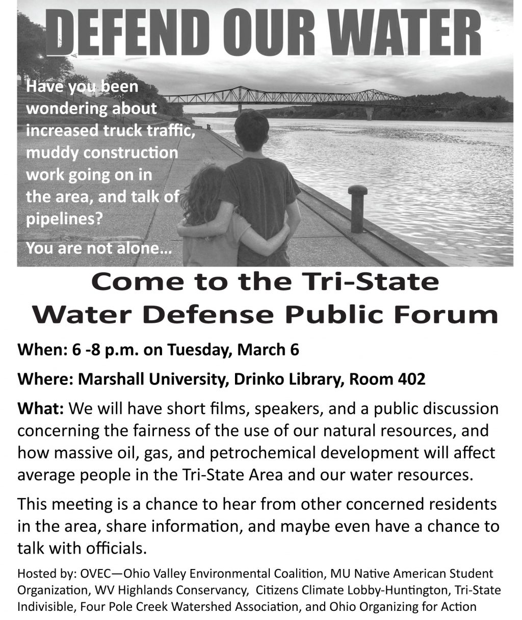 For those of you in the Huntington/Tri-State area, we hope to see you at the Tri-State Water Defense Public Forum, from 6-8 p.m. tomorrow evening, Tuesday, March 6. We meet at Marshall University, in Room 402 of Drinko Library.