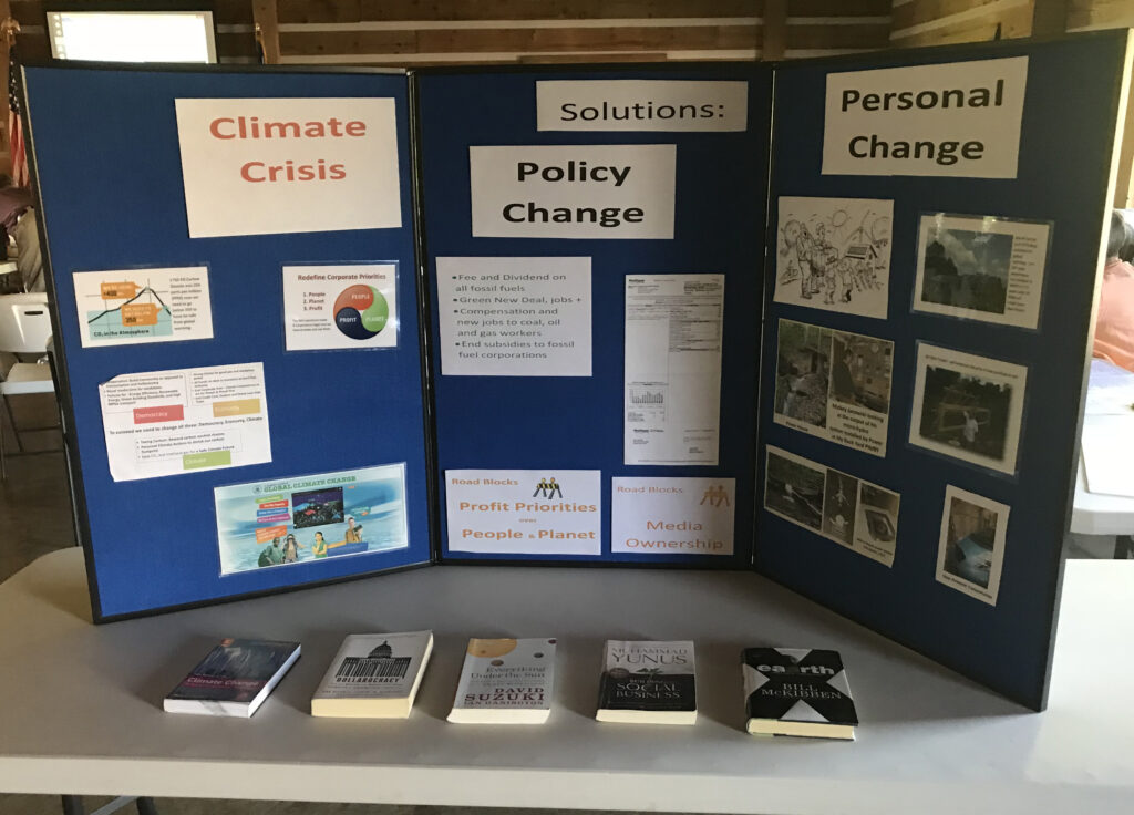 Among the exhibits at the event was a drawing of a map of the lower 48 states (above) made by Bill Reichenbach. On the map, which features rivers and mountain ranges, an X marks the locations where alarming climate-related events are underway or predicted. Bill provided informational sheets for each X. These informational sheets and some photos from the event are below.