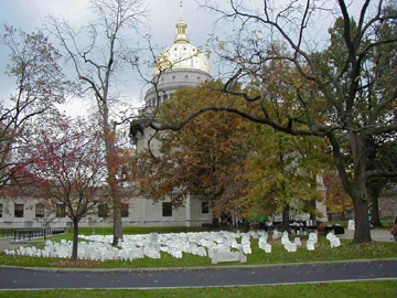Carol Jackson’s mock cemetery sits on the lawn of the state capitol. Each tombstone represents a mountain, stream or town lost to mountaintop removal.