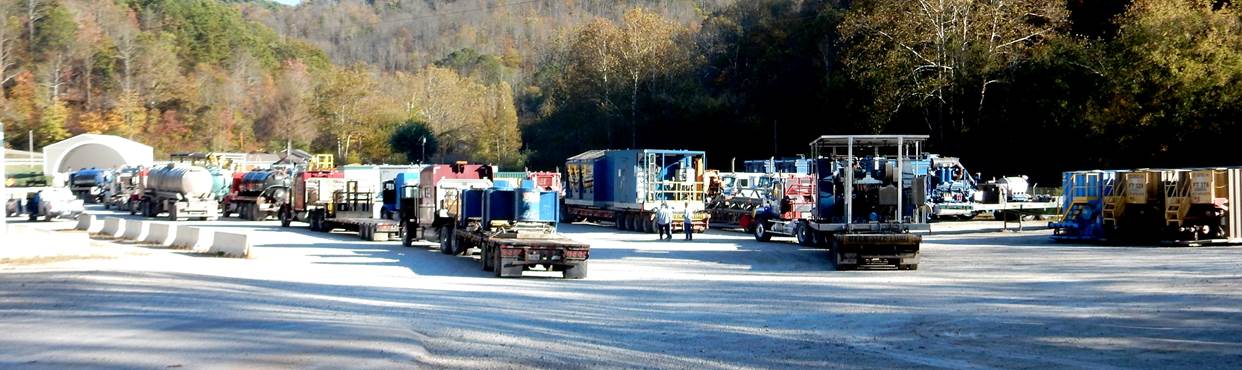 For the better part of two years the existing foot print of deep shale drilling related activity near my home in Wetzel County, which Chesapeake Energy (CHK) started more than eight years ago, was rather dormant. Recently Southwestern Energy (SWN) bought out CHK and now it has begun to ramp up its activity on a number of existing well pads. For me personally that means daily viewing of all their trucks in their parking lot right behind my mail box down at the paved road. Fortunately, my home is almost a mile away. The parking lot is partially shown below; to show everything, I’d need a wide-angle lens.