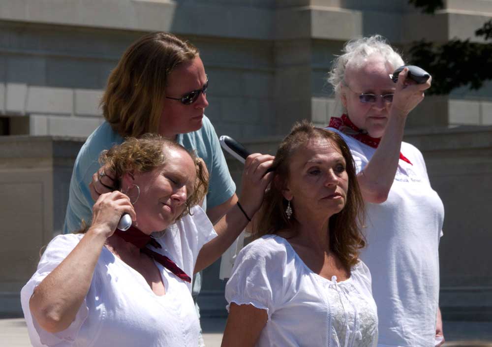 Donna Branham, second from left, bottom row, at an event in 2012, where several women shaved their heads in protest of mountaintop removal coal mining. Photo by Vivian Stockman.