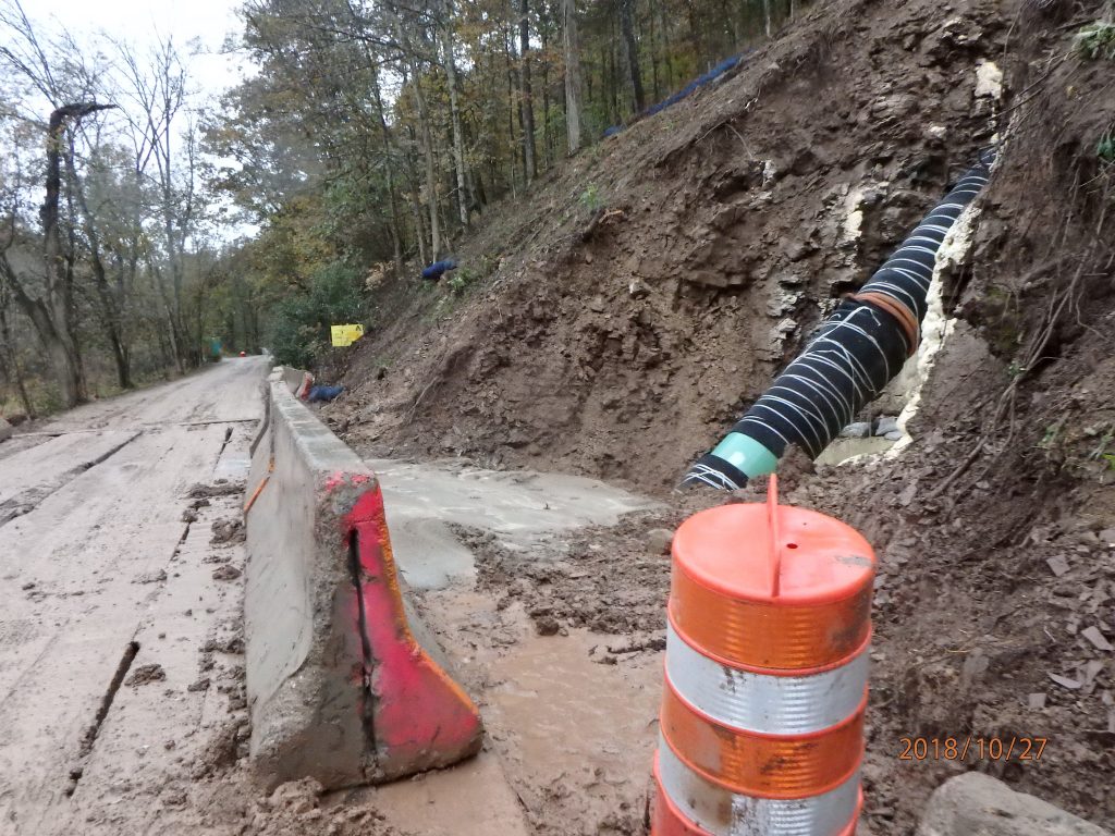 Yesterday, 12-2-2018, several slips occurred. The worrisome one was located where the pipe is buried on a very steep slope. The only thing that prevented the slip from going on the road was the foresight of a site supervisor to place timber mats behind the jersey barriers to stop they the soil movement. There were two additional slips that occurred outside of the ROW. Workers were out yesterday and today to clean up the mess.