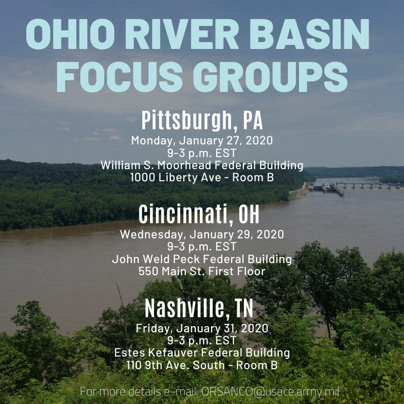 From the USACE: The Ohio River Basin Study is the biggest basin-wide study being conducted across the basin in many years. The study, being completed by the U.S. Army Corps of Engineers in partnership with ORSANCO (Ohio River Valley Water Sanitation Commission), will provide clear strategies and an action plan to advance six primary goals for water resources in the entire Ohio River Basin. These focus groups will look at refining existing strategies for the basin with a focus on the Knowledge and Informed Decisions goal.