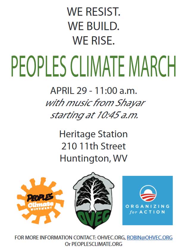 Note: The public and members of the press are invited to a poster making party for the Peoples Climate March Huntington Sister Rally and March (PCM Huntington), from 5-7 p.m. Tuesday, April 18, at the OVEC office, at 725 West 14th Street in Huntington’s Old Central City.