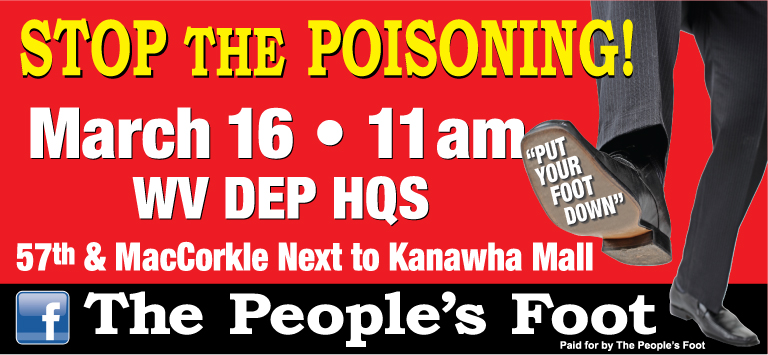 CHARLESTON, W.Va.—Today approximately 200 West Virginians rallied for healthy communities at the West Virginia Dept. of Environmental Protection (WVDEP) headquarters in Charleston. The People’s Foot, a coalition of West Virginia groups and individuals, held the “No More Mountaintop Removal Permits Day” to demand that the WVDEP stop issuing new permits for this coal extraction method. Mountaintop removal causes clouds of fine blasting dust, known to promote lung cancer and other diseases, to drift through communities.