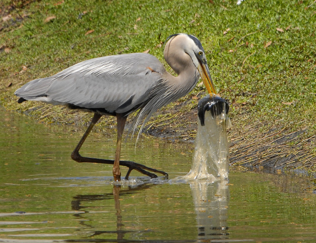 A Great Blue Heron swallows a fish in plastic bag. Photo by Andrea Westmoreland / Creative Commons