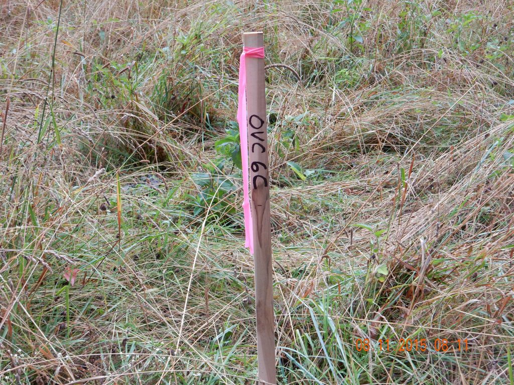 The markings on the other side of the stake identified it as locating the Ohio Valley Connector (OVC) pipeline; see photo below. The identifying numbers on the stake are unique, and the amount of detail on the stake is special, since this is for a very specific type of location called a control point.