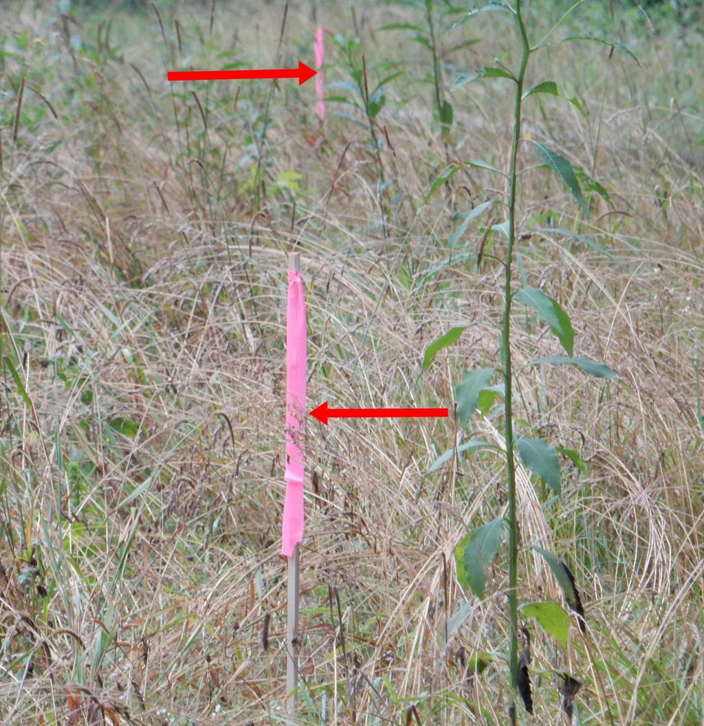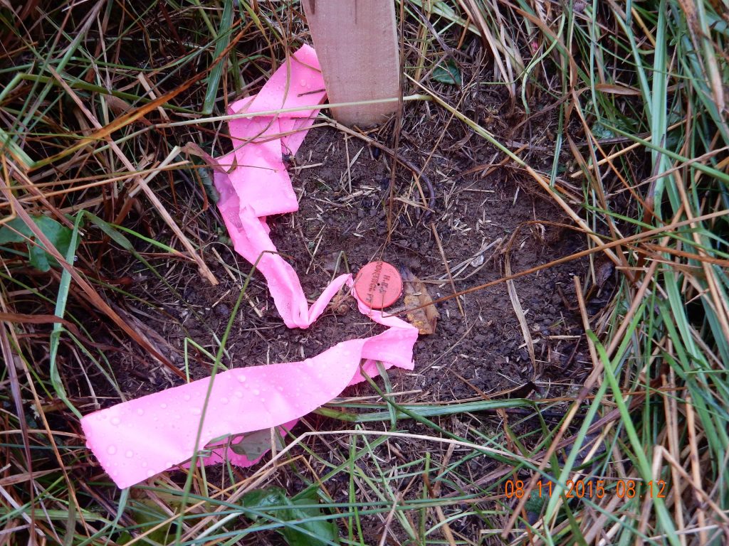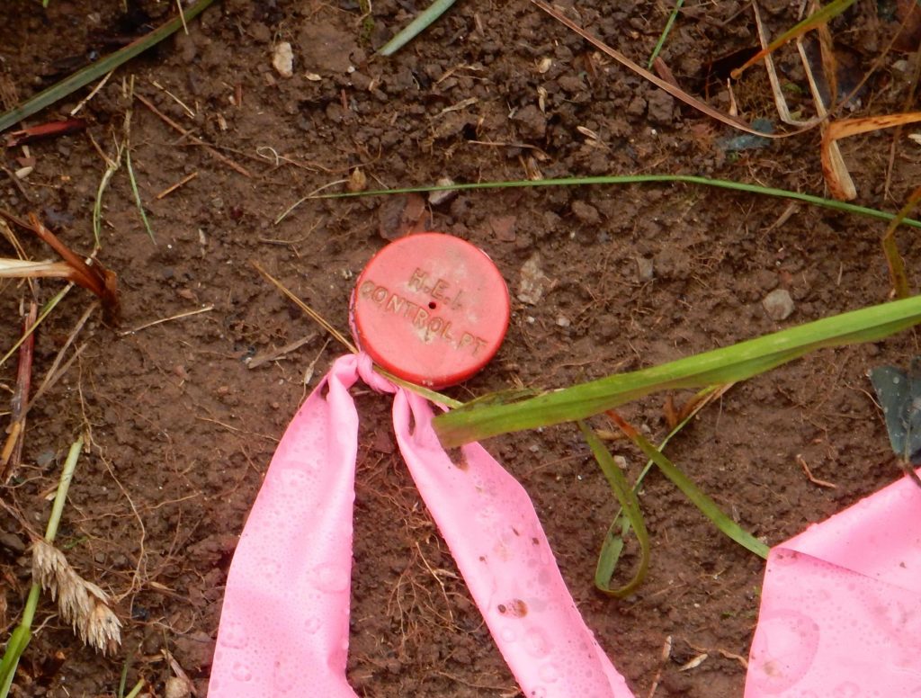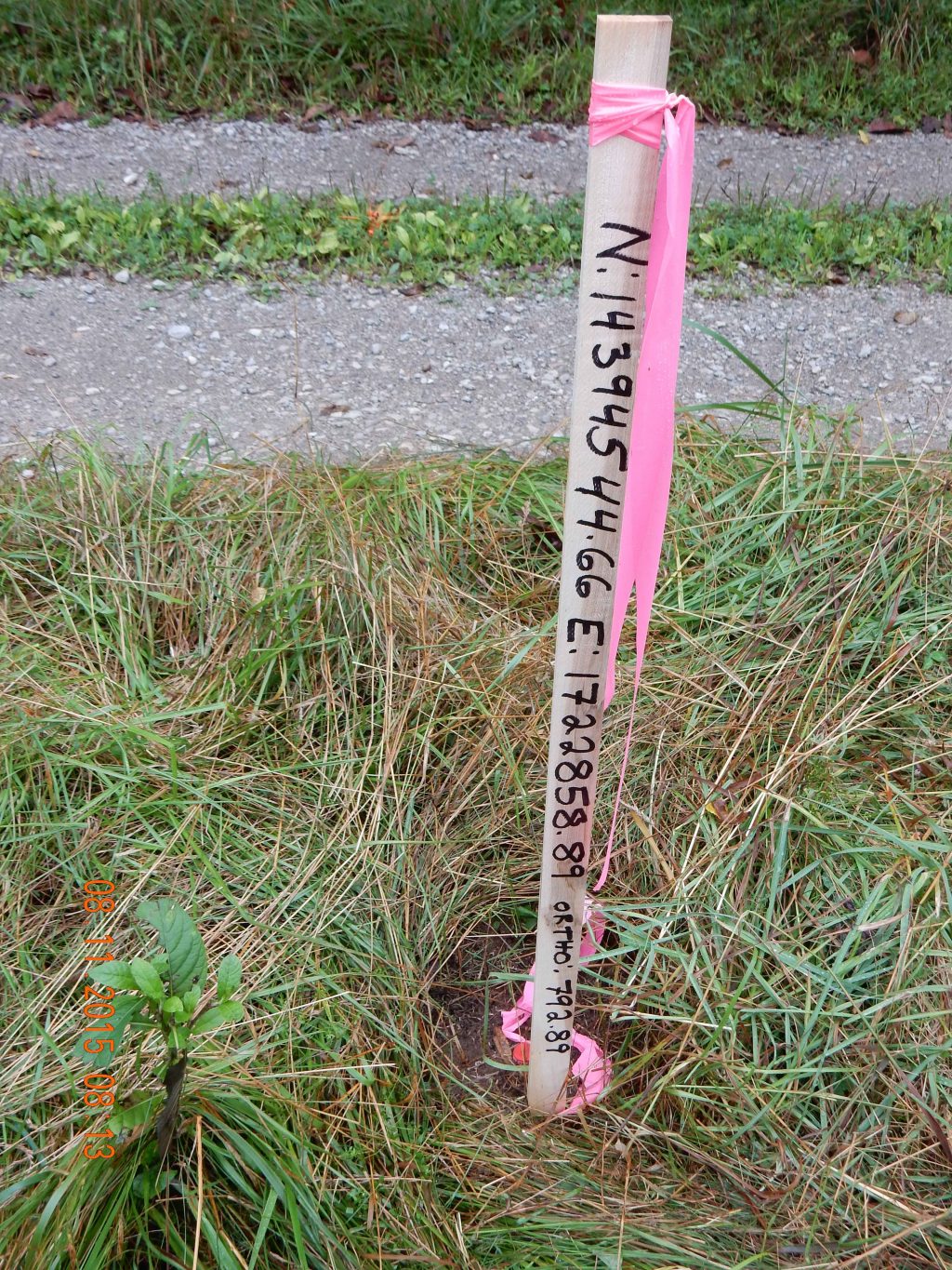 Upon closer inspection, it was obvious that these two stakes and flags had control point steel pins driven into the ground below them. This can be seen here: