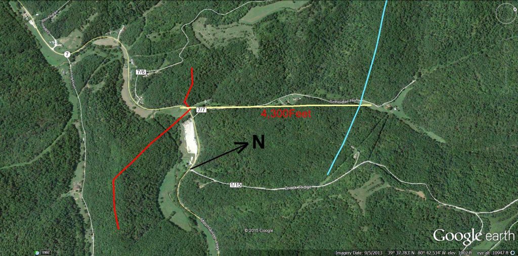 After all the stakes, ribbons, and steel pins were removed, EQT provided further insights into the bigger picture. Multiple pipeline routes were being evaluated by EQT. Gas companies always consider a wide range of constraints to pipeline construction such as road and stream crossings, available access roads, permission and cooperation of the many landowners, steepness of the terrain, etc. At a certain point in their evaluation, EQT chose a final route, but for unknown reasons the surveyor crew was given the old, now-abandoned route on which to establish a control point. The overall error can be seen on the map below, where the bright blue line is the original path of the OVC pipeline through my property, and the red line shows where the pipeline would go, if FERC approves it. A new control point has now been established near the highway where the pipeline would cross, if approved.