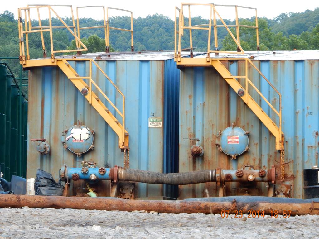 But the very worst case examples of antique tanks are shown below. These tanks should have been scraped for junk steel many decades ago, but were still being used in July of 2014 in Tyler County, during an active deep shale gas drilling and fracturing operation. These old blue tanks were on a horizontal well pad holding various fluids. Most of the fluids were kept in the tanks, most of the time. Some of liquids which leaked out where there was no containment of any type. If these are the best this particular operator could do, we can see why more stringent regulations are needed. Admittedly this still stands as one of the worst examples. It does not represent the best the current shale gas industry can do. But, to do the best costs money, and we far too often see cost-cutting measures by industry—which in the end means heavy costs to clean water and human health.