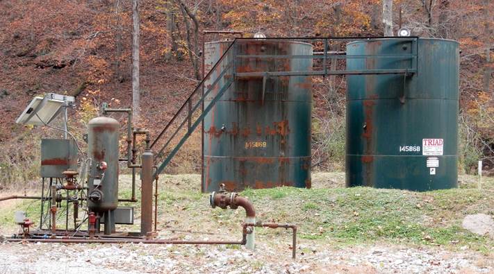 This tank combo set-up, below, is prominently on display in the Lewis Wetzel Wildlife Management area in Wetzel County. It does not actually inspire much confidence in the oil and gas industry’s conventional well maintenance and operations program, nor does it seems like a swell space for wildlife.