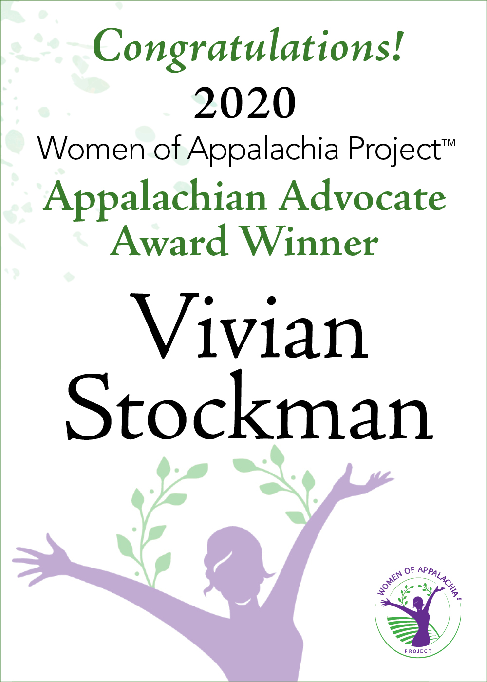 For Immediate Release March 6, 2020 ATHENS, OH – This week, the Women of Appalachia Project™ (WOAP™) announced that Vivian Stockman, executive director of OVEC, the Ohio Valley Environmental Coalition, is the recipient of the 2020 Women of Appalachia Project™ Appalachian Advocate Award. This award is given annually to a woman who has dedicated herself to enhancing the well-being of Appalachian culture, Appalachian women’s health, Appalachian families or Appalachian land issues. Since arriving in a small West Virginia community in the 1990s, Stockman has stood with local communities against well-heeled industries to fight for mountaintops, forests, water, and air. According to nominator Susan Truxell Sauter, “Vivian Stockman serves as the person who links it all together—if it means coaching women living in coal communities on how and where to speak about the health impacts of such industry whether at a county commission meeting or even at the United Nations. She jumps the synapse, providing names, education, and media support. She meets people on their own ground, repeatedly, making a personal connection—while amplifying their truth with emails, tweets, essays, op-eds, newsletter articles, and award-winning photographs.” Former OVEC Executive Director Janet Keating notes, “Vivian has developed long-term, trusting relationships with people in communities impacted by injustices of the coal industry. For example, she remains close to the Miller-Caudill family whose ancestral land and homeplace was surrounded and threatened by mountain top removal. The coal company had gone to court forcing the family to sell their land. Fortunately, the WV Supreme Court overturned the lower court’s decision. Vivian attended relevant hearings, communicated with family members and stood in solidarity with them. To this day, Vivian is invited to the Miller-Caudill annual family reunion.” According to Kari Gunter-Seymour, executive director of the Women of Appalachia Project, WOAP is proud to lift up women such as this year’s award recipient. Gunter-Seymour says, “Women often go unsung as they go about their work with passion and purpose, knowing what they do is truly for the good of all. Vivian is a prime example of someone who goes well beyond punching a time clock. Her dedication to the land is remarkable and should be celebrated.”