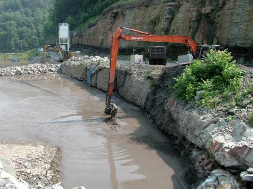 - Sump pump used to withdraw water from top of sediment ponds, then discharge it into downstream pond while the upper pond is dredged.