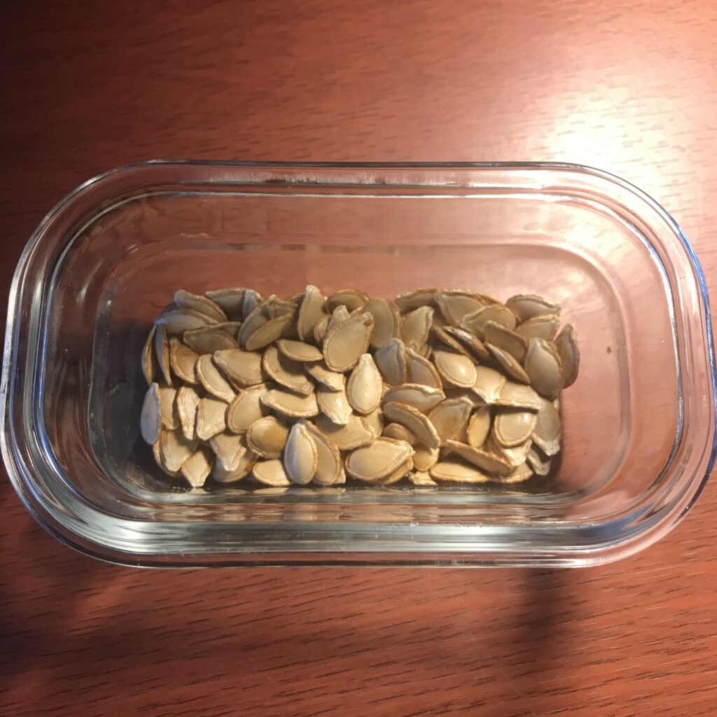 Several sources say winter squash tastes better if baked than boiled; you put it cut side down in the pan (yes, of course you cleaned out the seeds first), and maybe add a little bit of water but that’s not crucial. I like to throw some butternut or sweet potato in my oven when I’m running it anyway for something else (or regular potatoes, it’s also handy to have pre-baked potatoes around for omelets or at worst, chicken feed). When the baked, softened squash comes out of the oven, let it cool, then clean out the pulp with a spoon and compost the empty peels. The cooked squash will keep in the fridge for most of a week, or in your freezer practically forever. As for the seeds, some