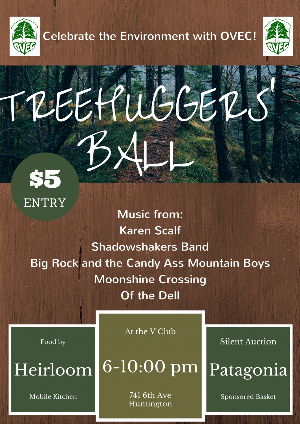 This Treehuggers’ Ball is presented and organized by the Board of Directors of the Ohio Valley Environmental Coalition; musicians and bands will include Karen Scalf, the Shadowshaker Band, Big Rock and the Candy Ass Mountain Boys, Moonshine Crossing and Of The Dell.